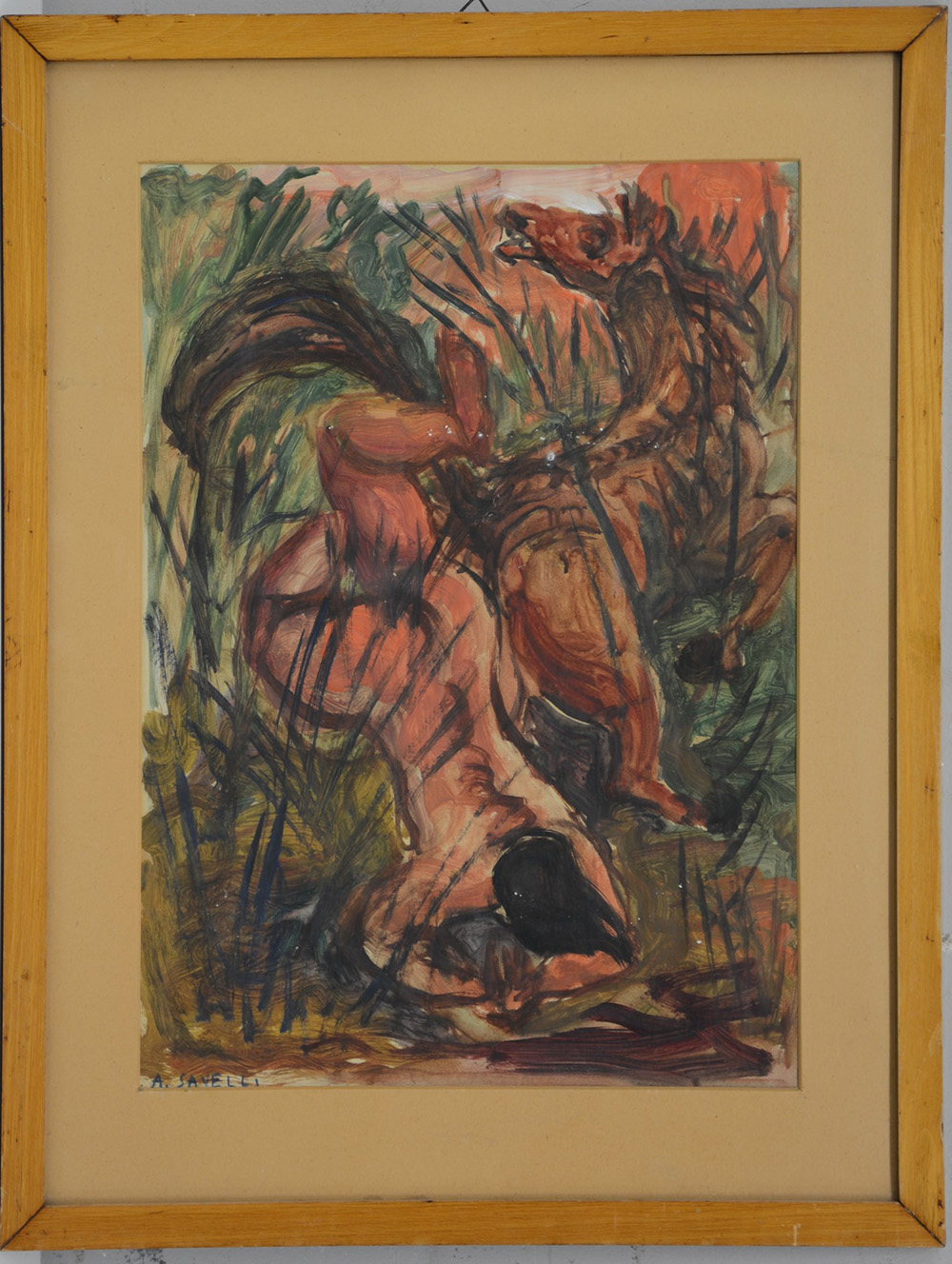 Savelli "Cavaliere disarcionato" tecnica mista su carta (cm 41,5x29,5) firmato in basso a sinistra. In cornice