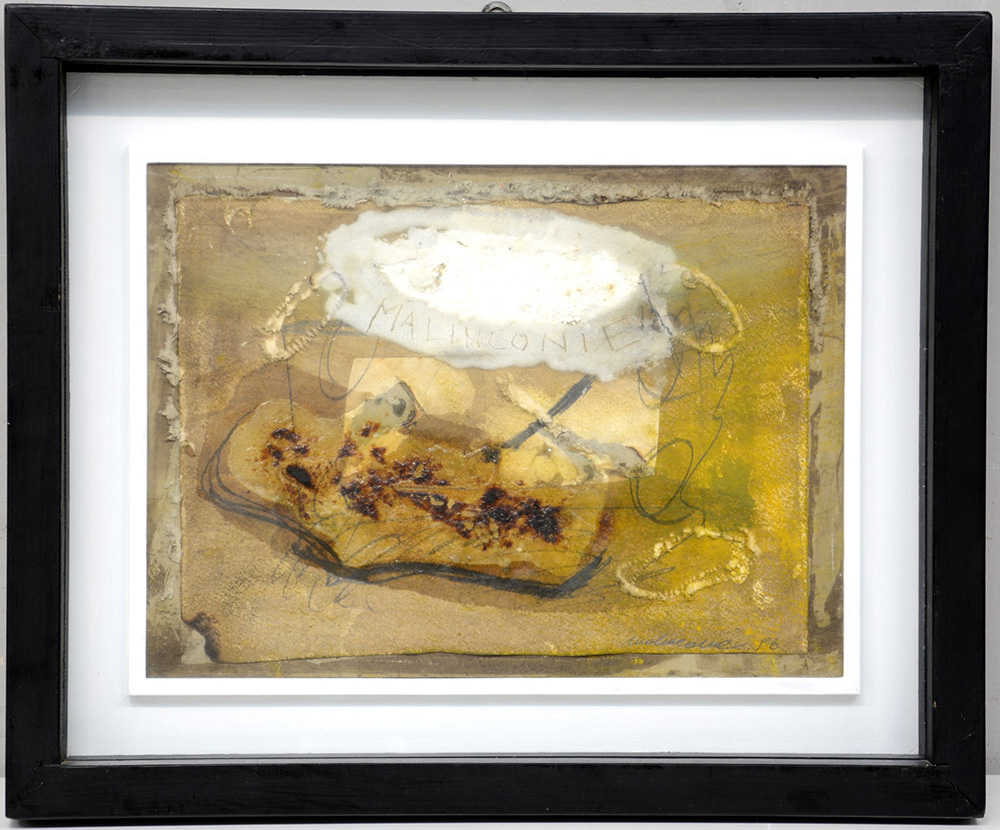 Mondazzi "Malinconie" tecnica mista, collage e concrezioni su cartone pressato (cm 30,5x42) firmato e titolato in basso a destra. In cornice