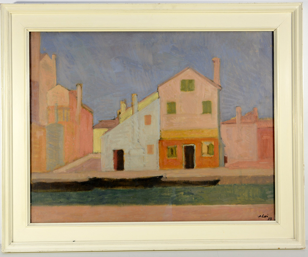 Roberto Aloi. "Burano" 1973, olio su tela (cm 56x70) firmato e datato in basso a destra, firmato, datato, titolato e dedicato al verso.In cornice