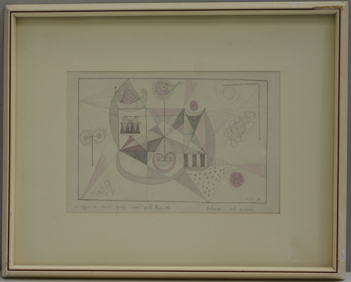 Ferroni "Balcone sul mare" 1947, tecnica mista su carta (cm 19x29) firmato e...