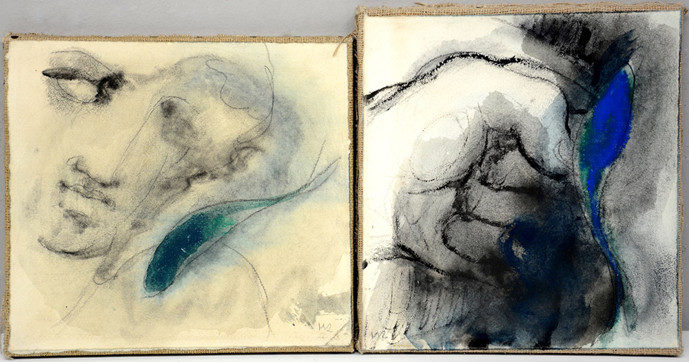 Ignoto, lotto composto da due dipinti a tecnica mista su carta intelata (cm 22,5x24,5) uno siglato MR