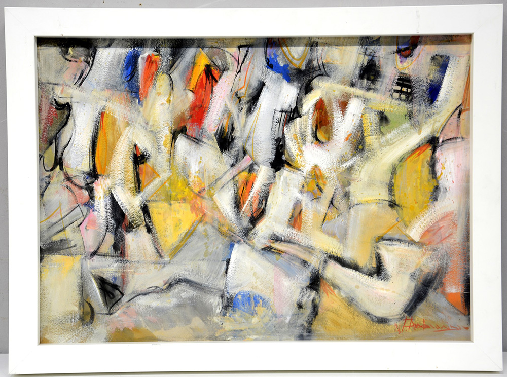 Firma indecifrata "Composizione astratta" tecnica mista su cartone (cm 50x70) firmata in basso a destra. In cornice†