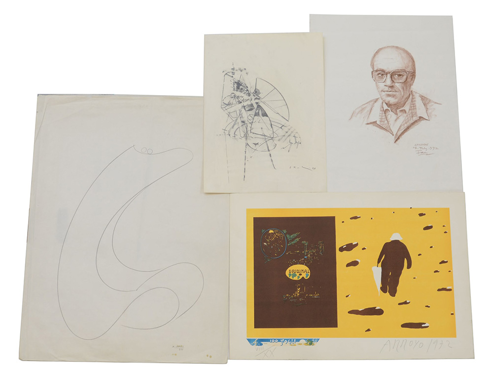 Cartella contentente una litografia di Arroyo, un disegno a firma Viani e due disegni a firma indecifrata, tecniche e misure diverse (difetti)