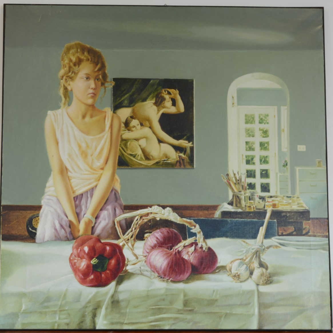 Ignoto "Nello studio", olio su tela (cm 120x120) iscritto "De Andreis" e titolato al verso, in cornice contenitiva (difetti)
