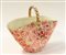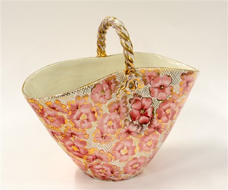 Manifattura Sacas, San Marino Cestino in ceramica decorato a fiori in rosa e oro. Ansa a corpi intrecciati (difetti)