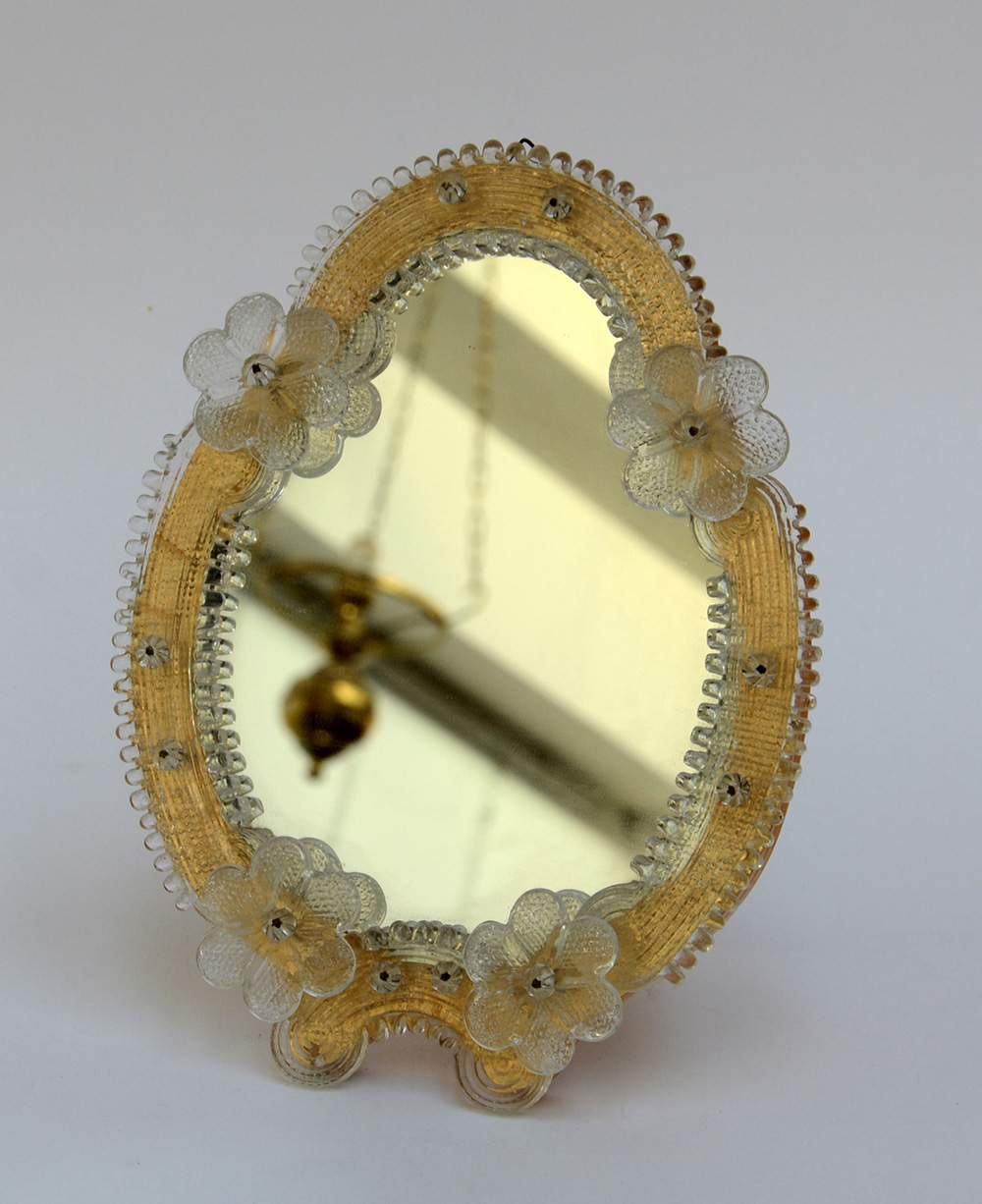 Manifattura di Murano Specchiera da tavola decorata a fiori in vetro incolore. Sec XX (h cm 26) (modifiche)