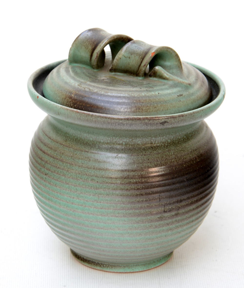 Vasetto in terracotta smaltata in grigio e verde con coperchio. Italia, anni 40. Marcato e numerato sotto la base (h cm 13) (lievi difetti)
