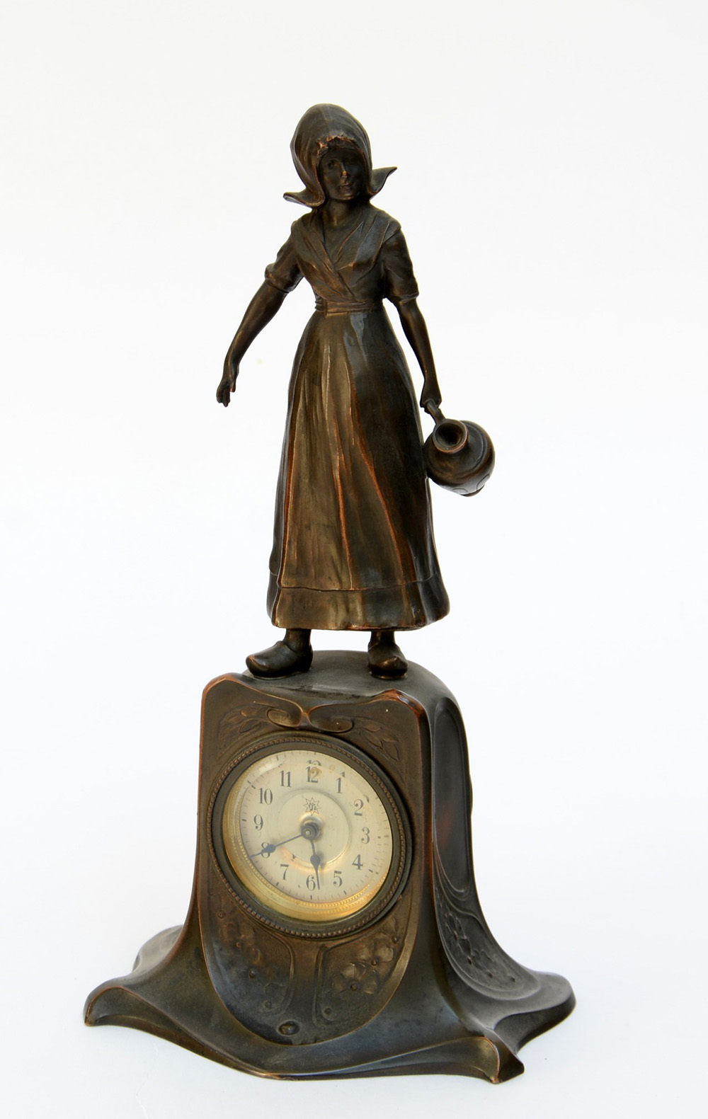Orologio da tavola Art Nouveau in fusione metallica sormontato da figura di acquaiola. Sec XX (h cm 25)