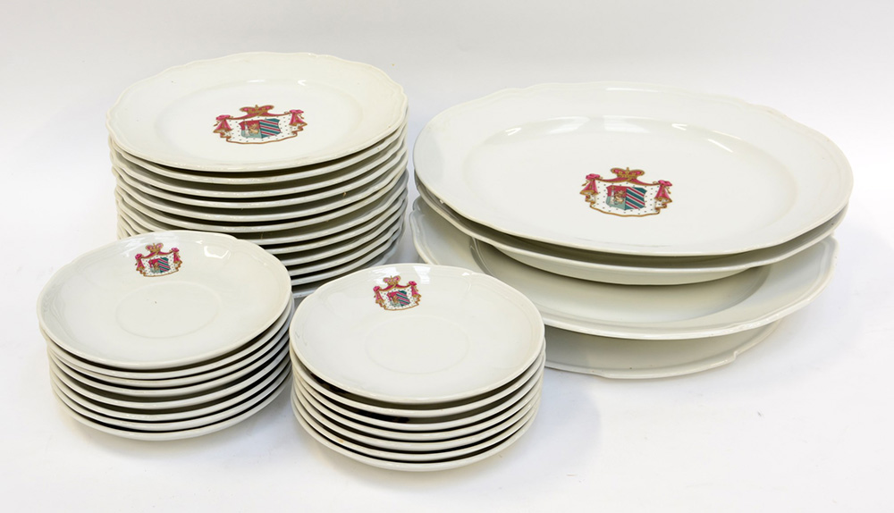 Manifattura di Ginori. Parte di servizio di piatti in porcellana decorati a stemma (difetti)