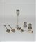 Lotto composto da due saliere con punzoni russi e due cucchiai, un colino, una pinza e vasetto con punzoni inglesi arg. 800/925. (gr 380)