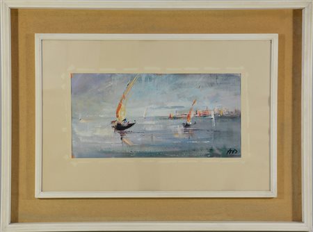 Firma indecifrata "Barche" olio su tela (cm 22x43,5). In cornice