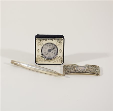 Lotto composto da un orologio da tavola e due oggetti diversi in argento tit. 800/925 (gr 100 lordi ca)