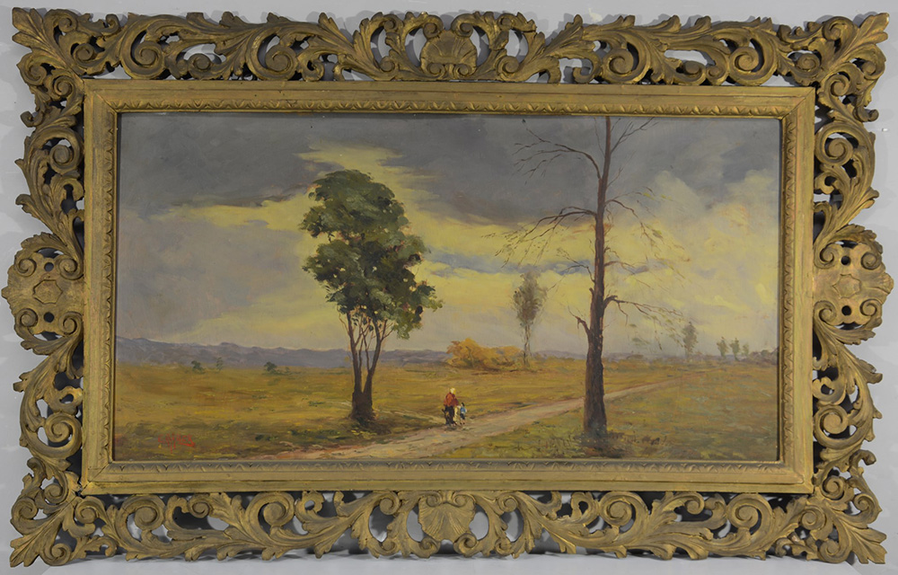 Muller "Paesaggio con figure" Olio su compensato (cm 60x120). Firmato in basso a sinistra. In cornice intagliata e dorata