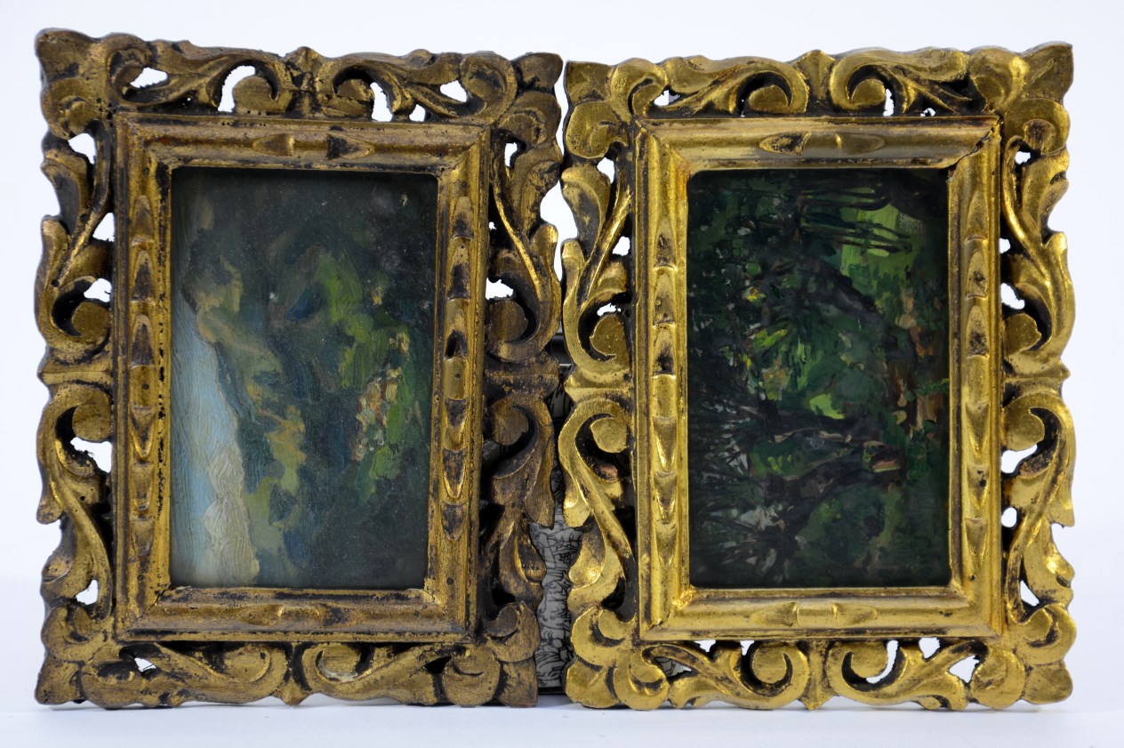 Firma indecifrata, "Paesaggi", coppia di olii su tavoletta (cm 9x14) iscritti al retro