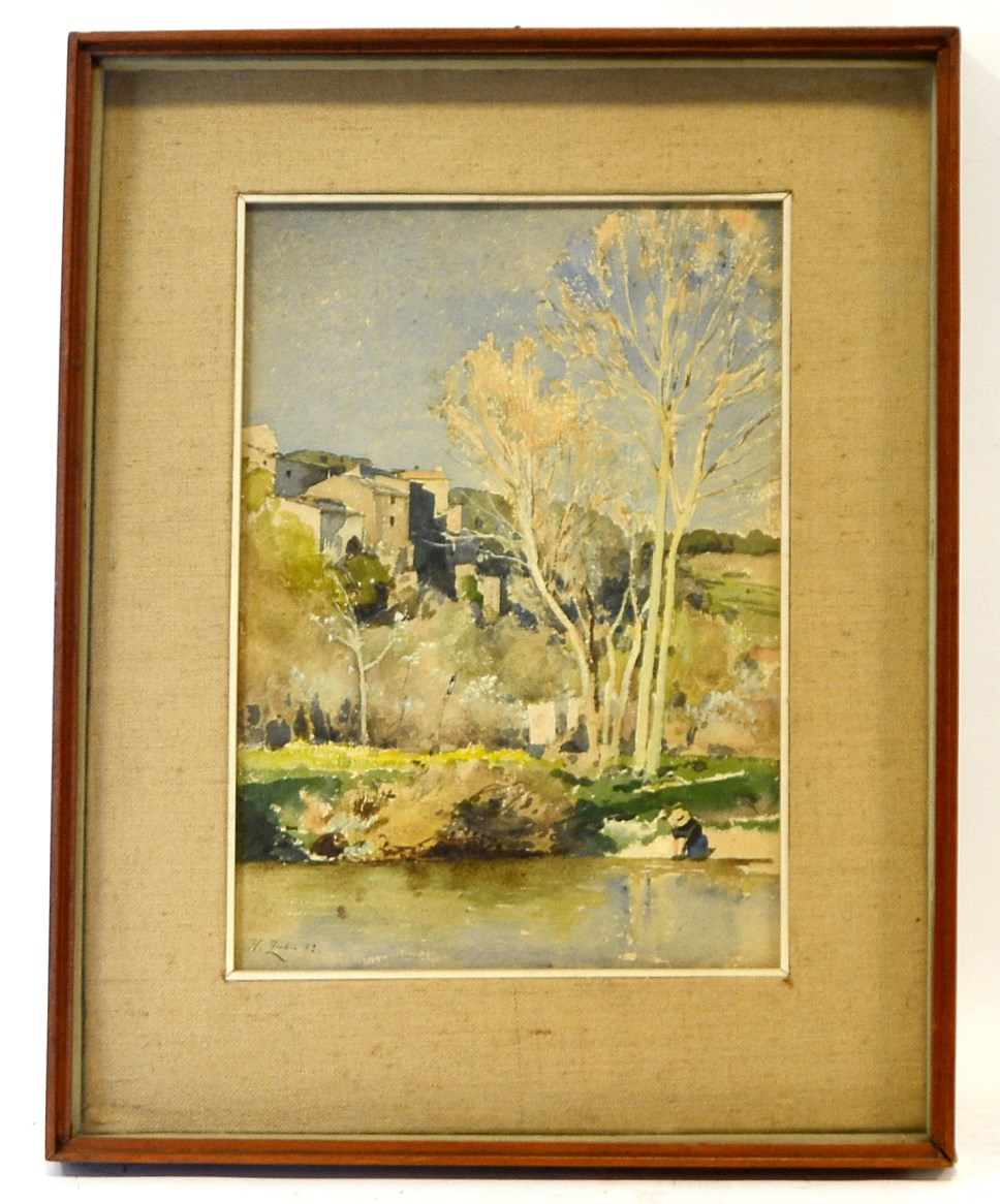 Zuber "Paesaggio con lavandaia" tecnica mista su carta (cm 34x24) firmato e...