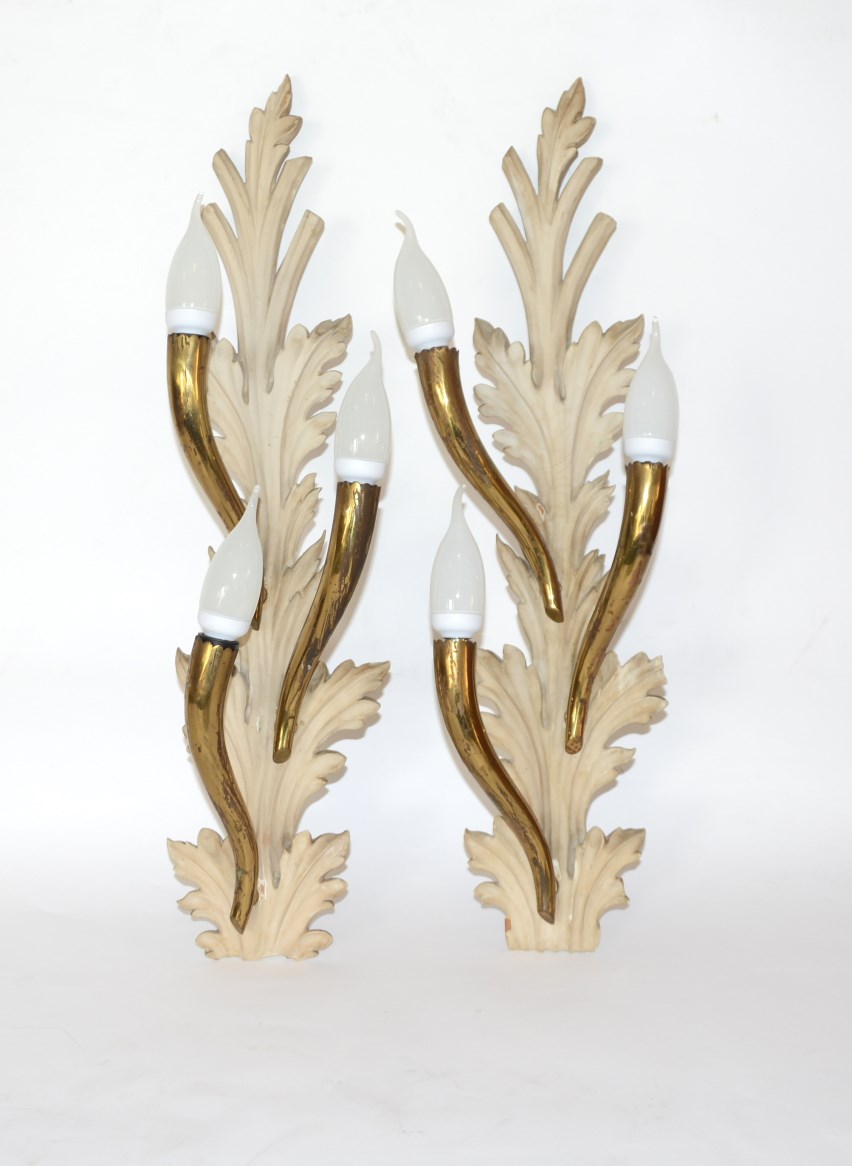 Coppia di applique a tre luci con sostegno in legno dolce intagliato a foglie e braccia in metallo dorato, anni '50 circa (h cm 61) (difetti)