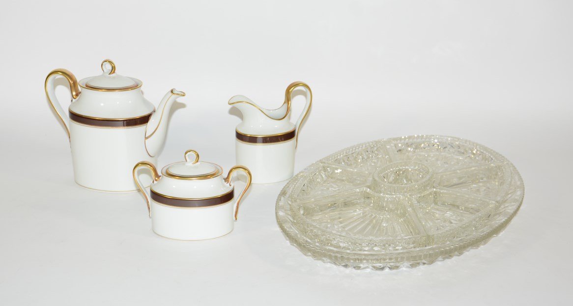 Lotto composto da un'antipastiera ovale in cristallo molato e una teiera, lattiera e zuccheriera in porcellana (difetti)