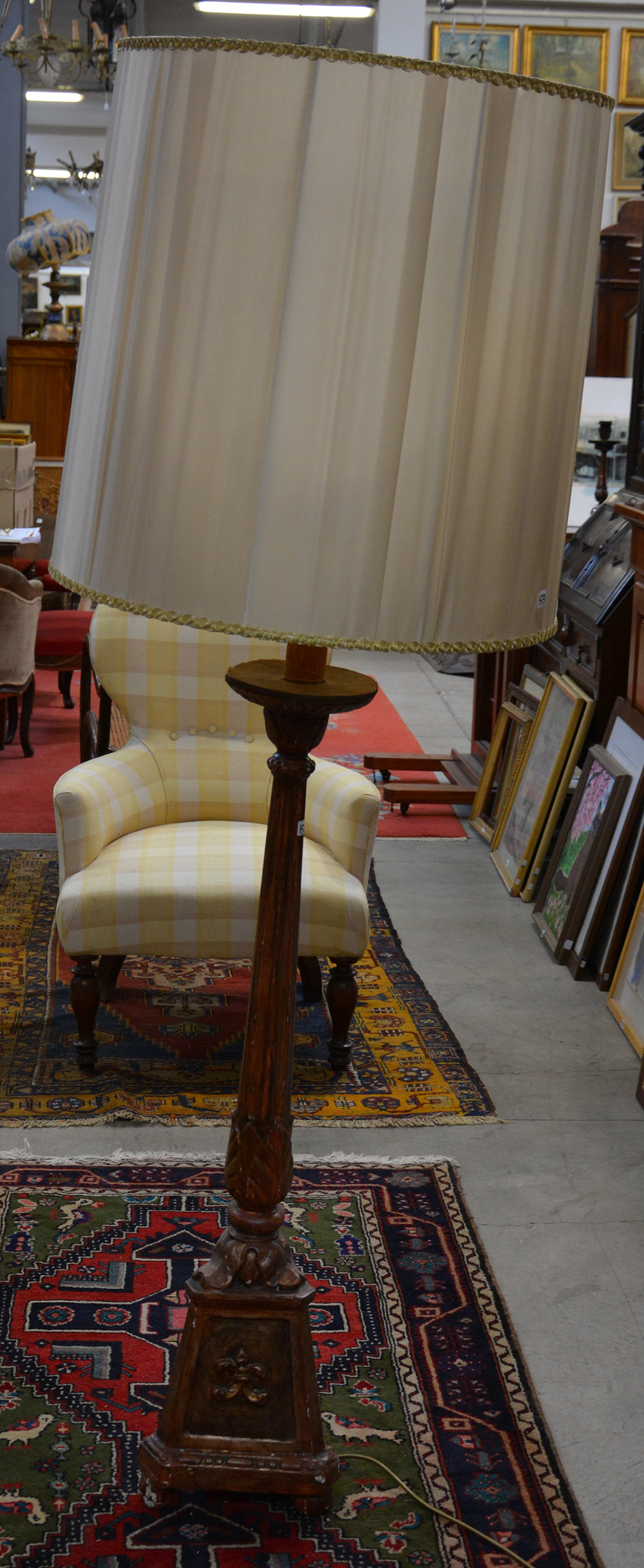 Portacero montato a luce elettrica in legno intagliato e laccato con basamento triangolare, fusto a colonna rastremata con attacco fogliato (h cm 163 pi˘ paralume) (difetti)