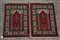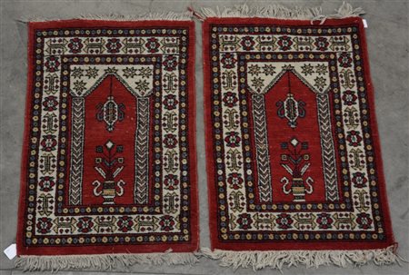 Coppia di scendiletto nazionali di moderna manifattura. Disegno a preghiera nei toni del rosso e bianco (cm 101x64 cad) (difetti)