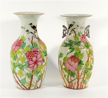 Due vasi in porcellana con decorazione a fiori e uccelli di cui uno biansato, Cina, sec. XX (h. 43 cm.)