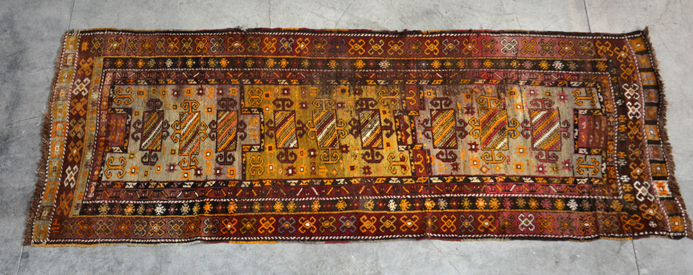Tappeto anatolico, inizio secolo XX. Disegno a doppia nicchia geometrico nei toni del giallo, rosso e marrone (cm 316x123) (difetti)