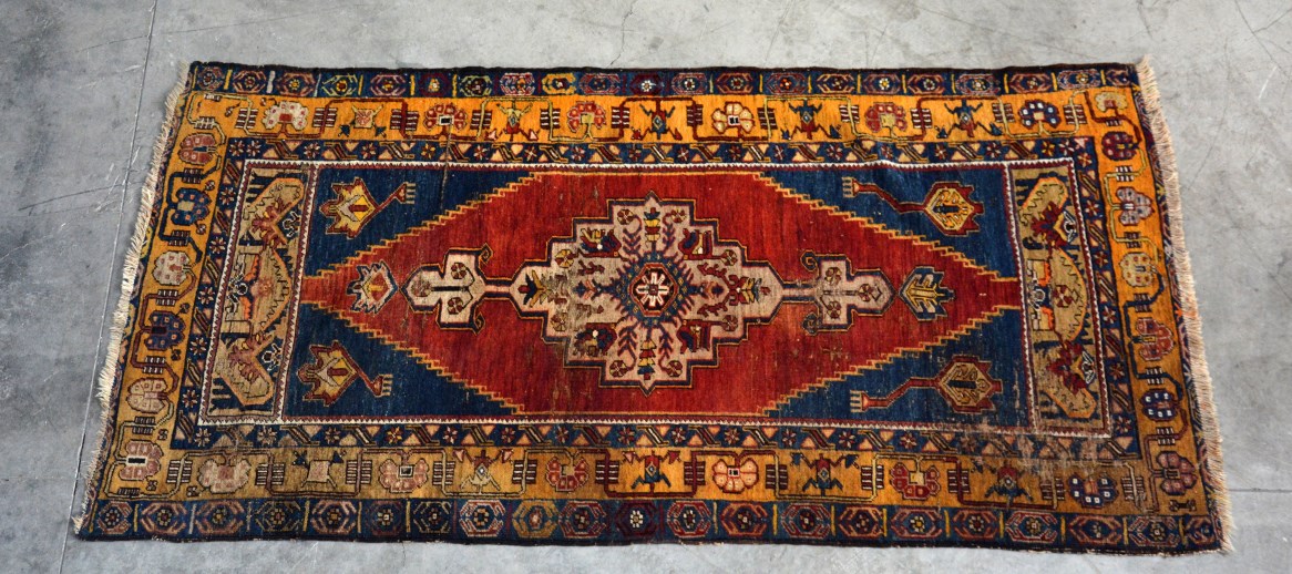 Tappeto anatolico, inzio secolo XX. Disegno a medaglione beige su fondo rosso, angolari blu (cm 225x118) (difetti)