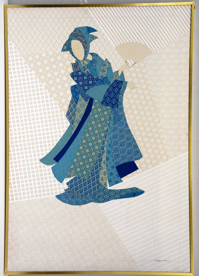 Firma indecifrata "Donna in costume giapponese" serigrafia (cm 100x70). In...