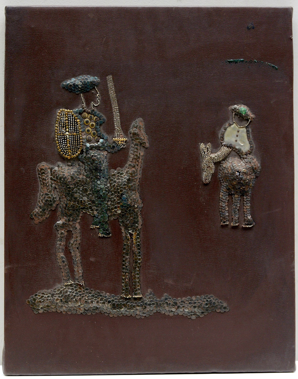 Ignoto "Don Chisciotte e Sancho Panza" composizione polimaterica su skai (cm 55x43) (difetti)