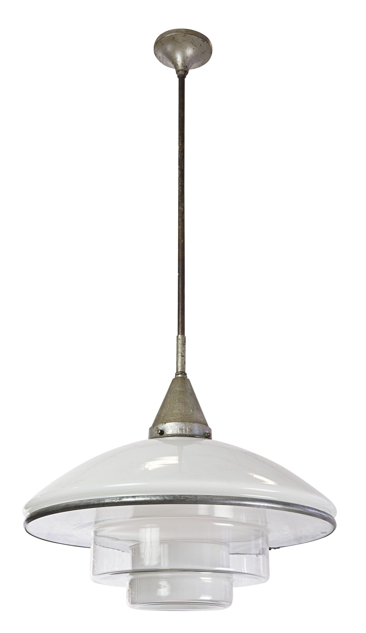 MULLER OTTO - Sistrah mod. P4.5, Lampada a sospensione. Metallo nichelato con paralume in vetro. Prod. Muller & Zimmer 1931. H cm 105, diam. cm 50. Bibl.: C. e P. Fiell, "1000 Lights", vol.I, Taschen, 2005, pag. 319, 320.