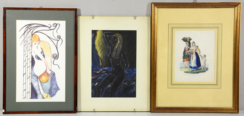AA. VV. Lotto composto da due stampe e da un disegno a tecnica mista, misure diverse. In cornici (lievi difetti)