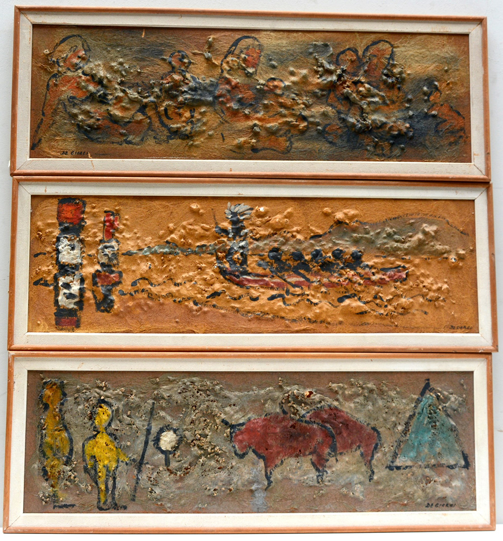 De Giorgi "Composizioni" Lotto composto da tre dipinti a tecnica mista su supporti diversi (cm 28x93) firmati. In cornici (difetti)