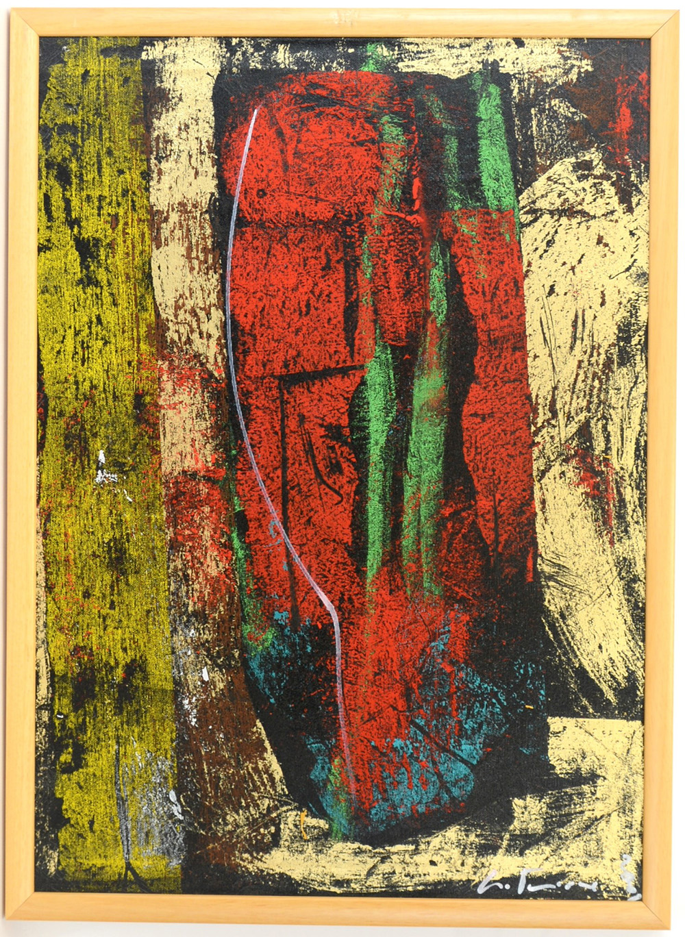 Firma indecifrata "Composizione astratta" 2003, tecnica mista su tela (cm 70x50) firmato e datato in basso ed al verso, reca etichetta ArteInvest "Fiore Giuseppe" al verso. In cornice