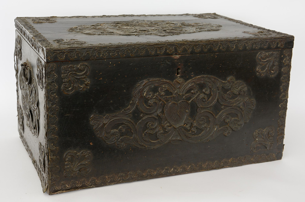 Lotto 1622 | Antica cassetta in legno decorato con applicazioni in metallo a volute e...
