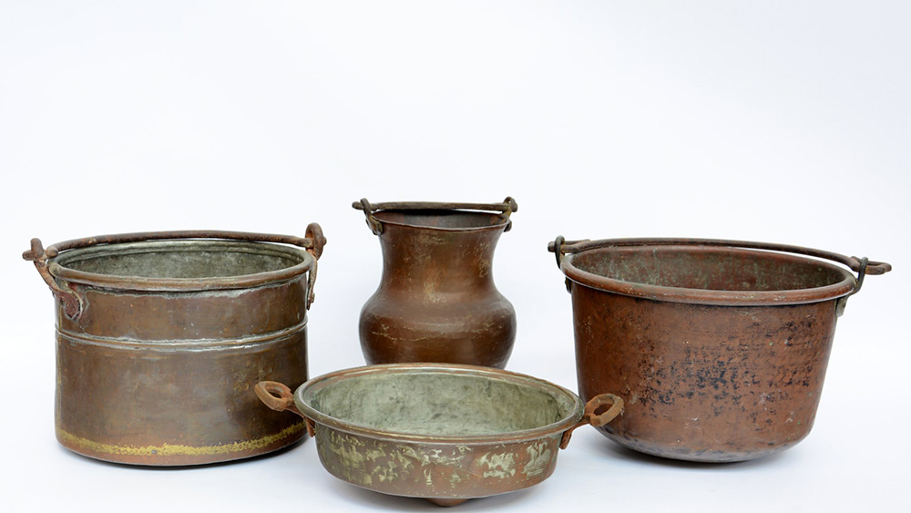 Lotto composto da due pentole e due contenitori in rame (difetti)