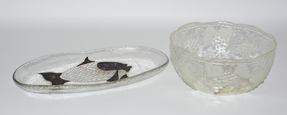 Lotto composto da un vassoietto ovale in vetro e lamina d'argento decorato con pesce e da un centrotavola in vetro decorato in rilievo con tralci di vite con grappoli