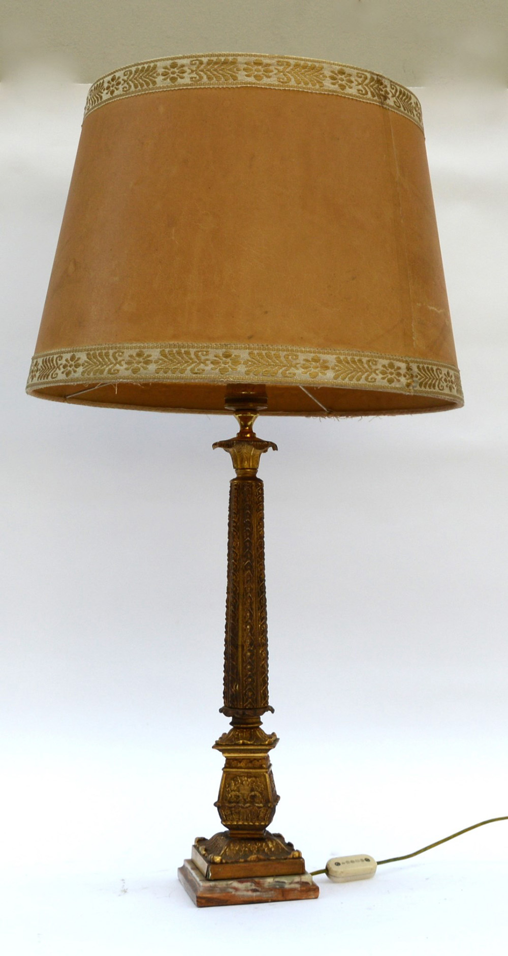 Lampada da tavolo in metallo dorato decorata a racemi, base in pietra dura (h cm 78)