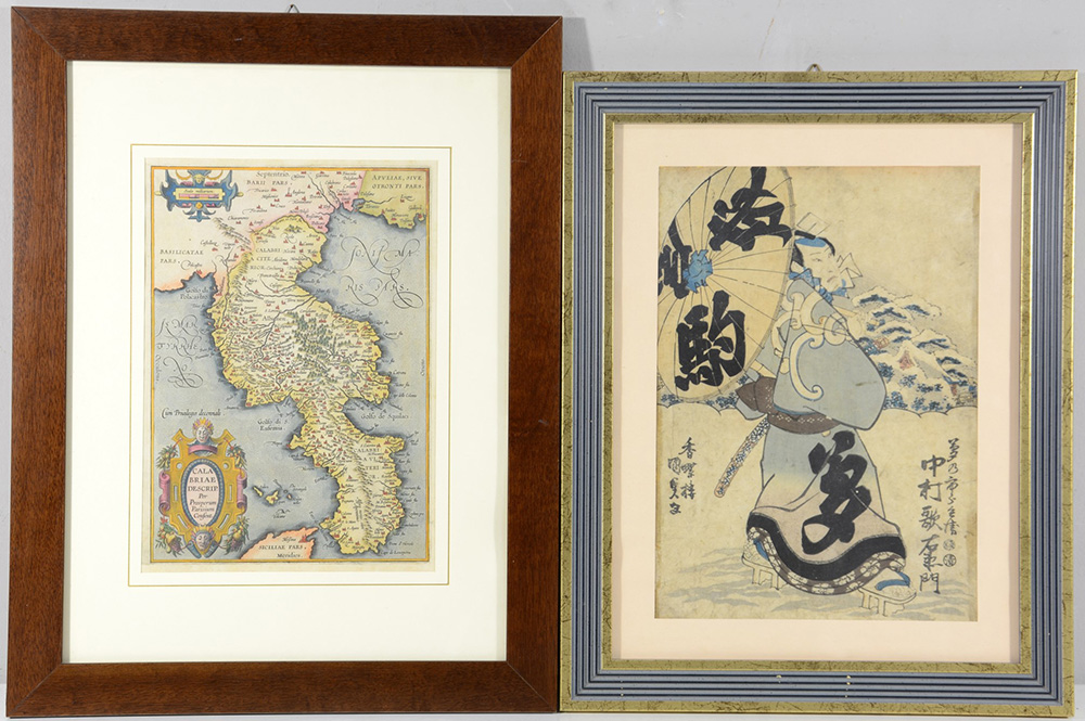 Lotto composto da una stampa giapponese e da una raffigurante la Calabria, misure diverse. In cornici