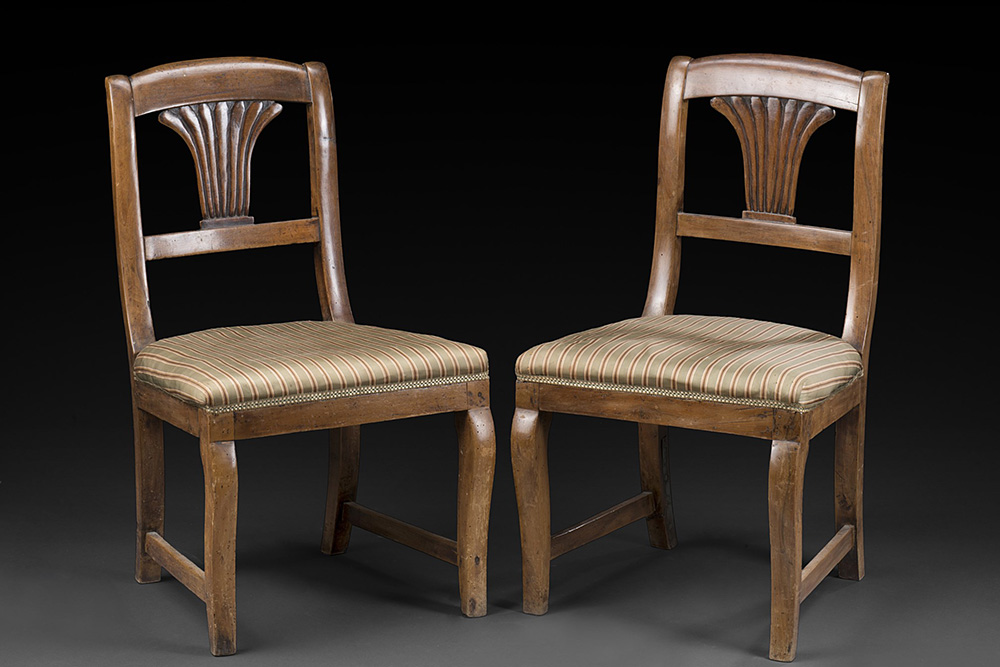 Coppia di sedie in legno chiaro di forma mossa con schienale intagliato (lievi difetti)