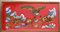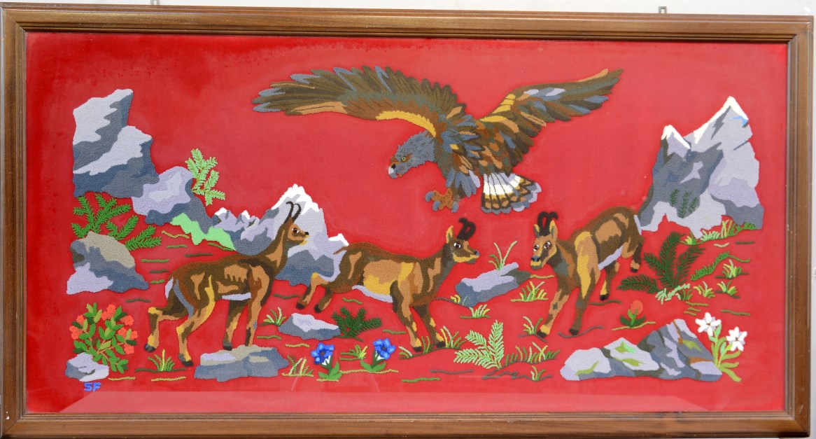 Grande pannello in lana su fondo rosso raffigurante un paesaggio montano con camosci e aquila (cm 68x138) siglato "SF" in basso a sinistra. In cornice