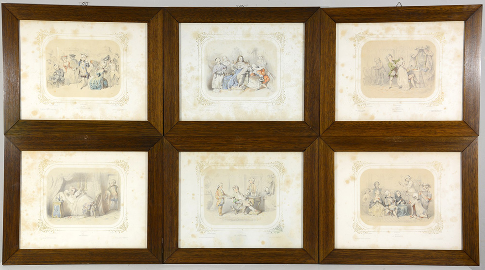 Gruppo di sei litografie francesi a colori raffiguranti scene di vita quotidiana, in cornici