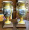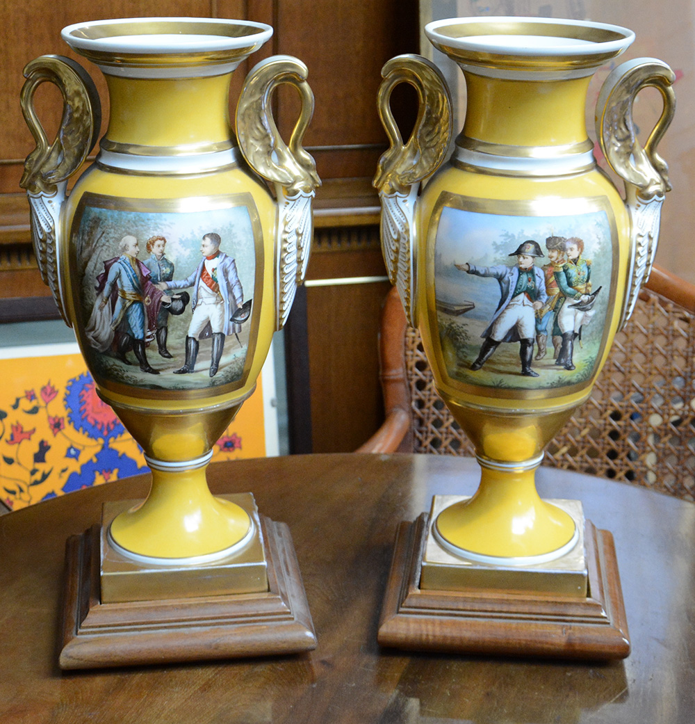 Coppia di vasi biansati in porcellana smaltata color ocra con rilievi in oro, anse a forma di cigno e scene napoleoniche entro riserve. Basamenti in legno (h totale cm 50) (lievi difetti)