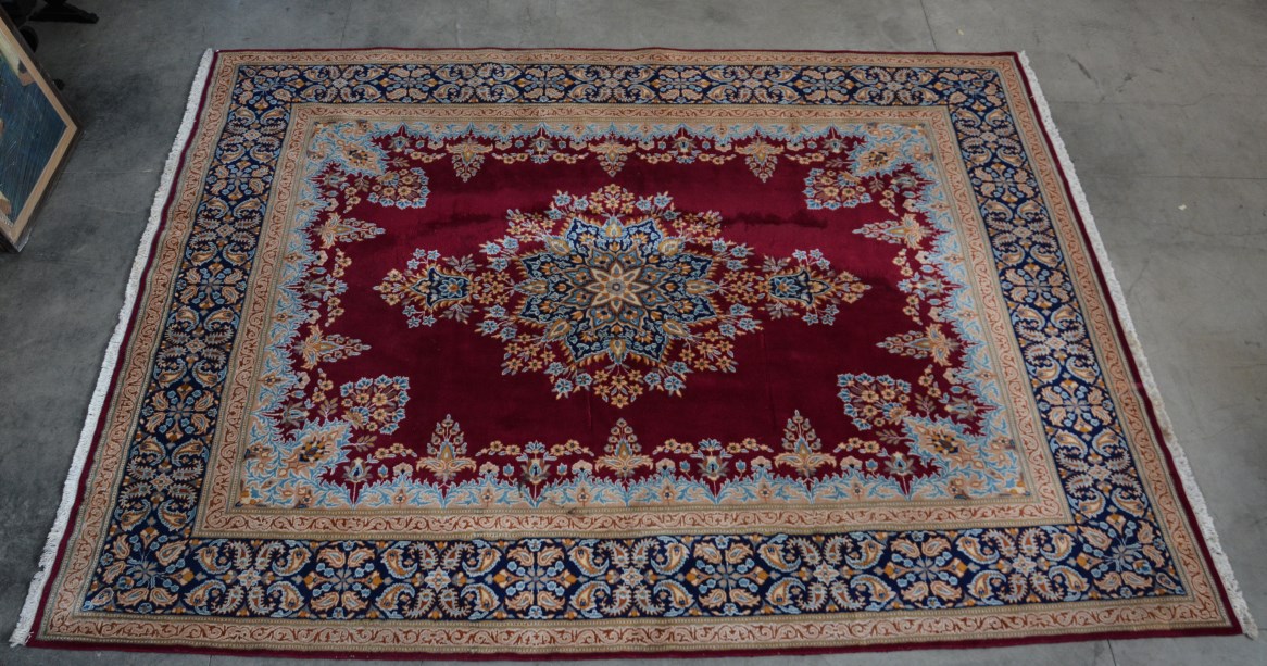 Tappeto europeo, disegno koranÏ con medaglione azzurro e blu su fondo bordeaux (cm 398x305( (difetti)