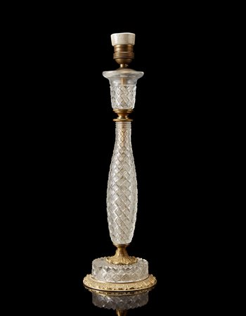 Candeliere stile Impero con fusto in cristallo molato. Ghiere in bronzo (h. cm 37) (difetti e mancanze)