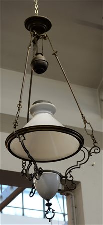 Lampadario in ottone con campana in vetro lattimo. 1920 ca. (difetti)