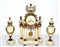 Trittico da camino in marmo bianco e bronzo dorato e cesellato composto da pendola con quadrante smaltato a numeri arabi e da due candelieri a una fiamma. Sec. XIX (difetti)