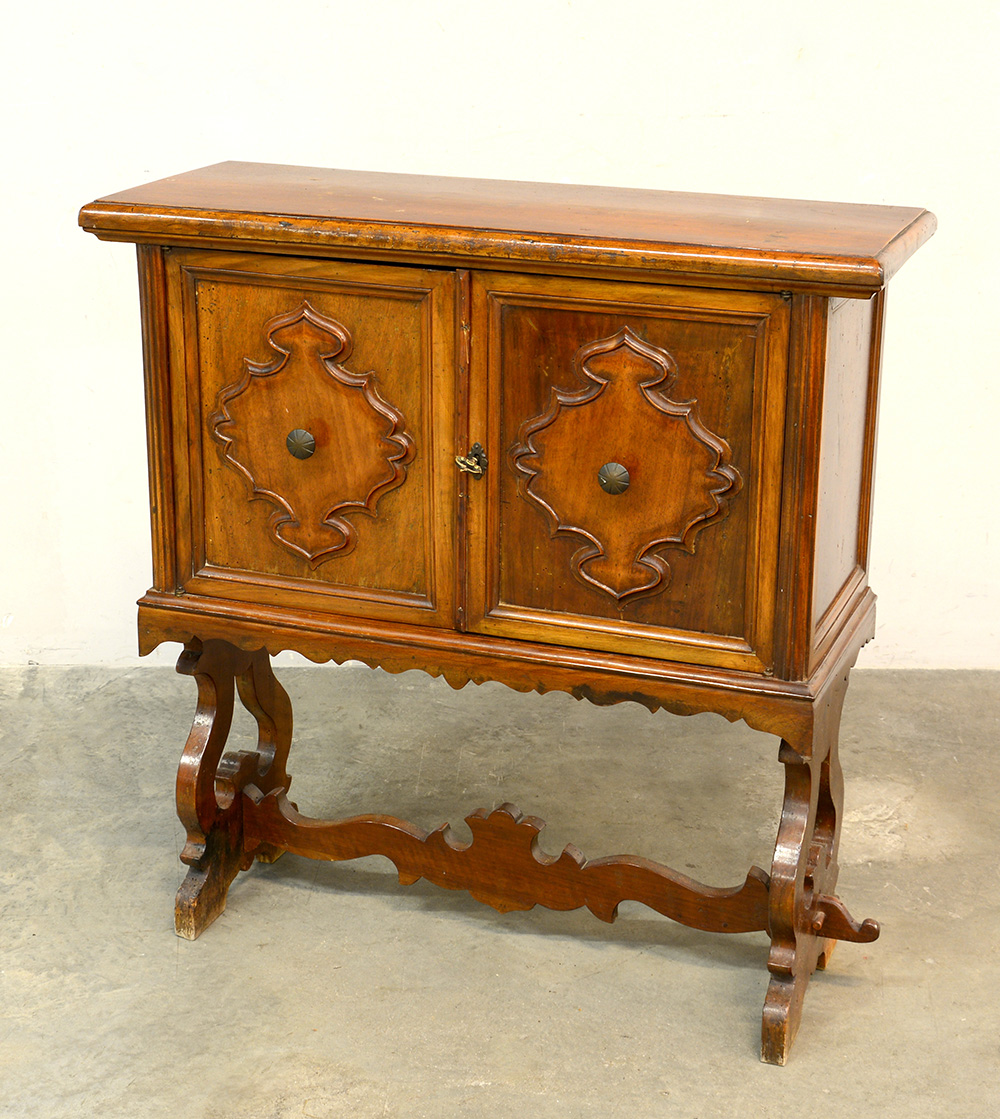 Mobiletto a due ante pennellate, gambe e traverse sagomate (cm 88x92x34) (lievi difetti)