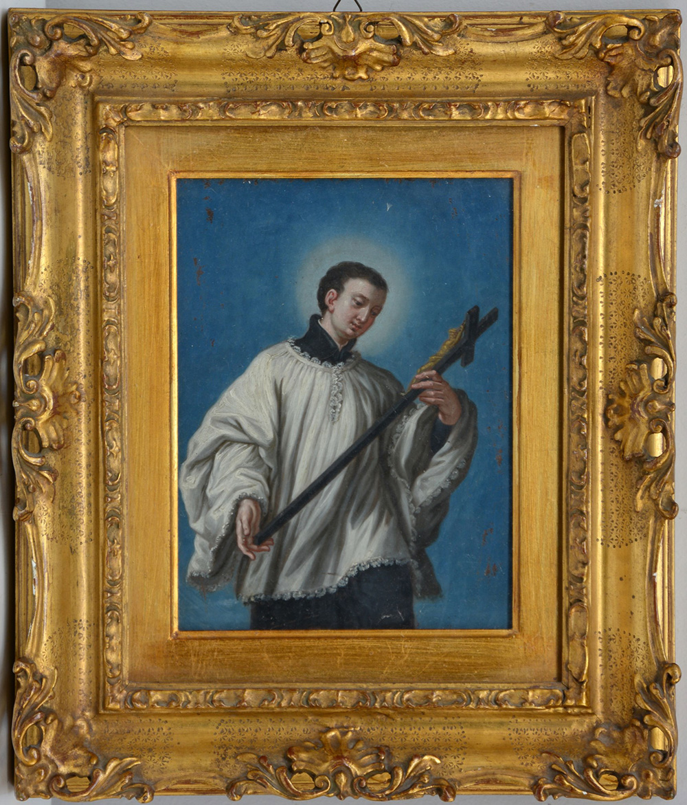 Scuola del sec. XVIII - "Chierico con crocefisso", olio su rame (cm 24x18), in cornice (difetti)
