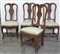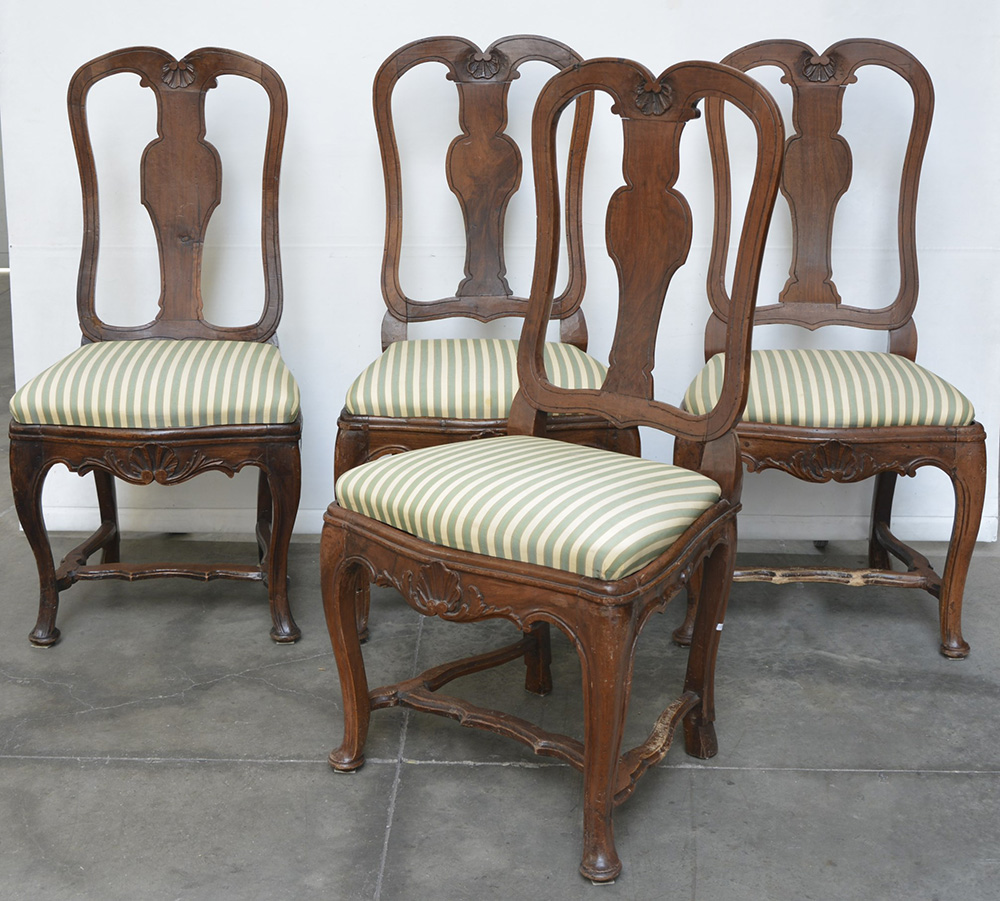 Gruppo di quattro sedie in noce con schienale e fascia sagomati e intagliati a motivo di conchiglia. Quattro gambe mosse, sec. XVIII (difetti e mancanze)