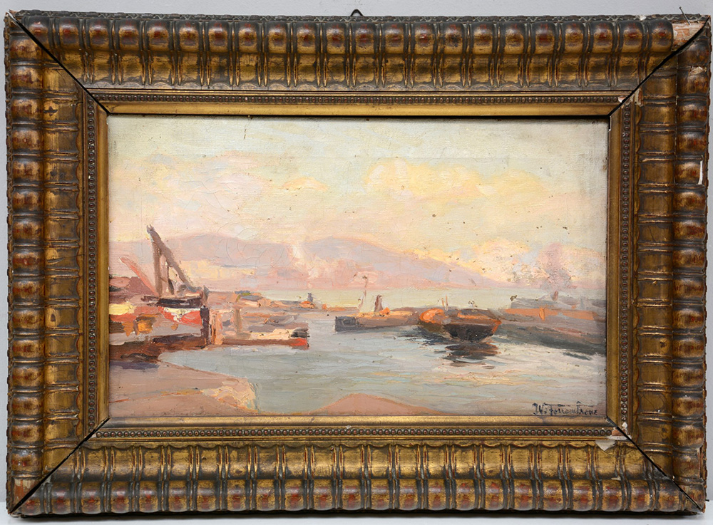 Fossombrone "Il porticciolo", olio su tela (cm 29x48) firmato in basso a destra, in cornice (difetti)†