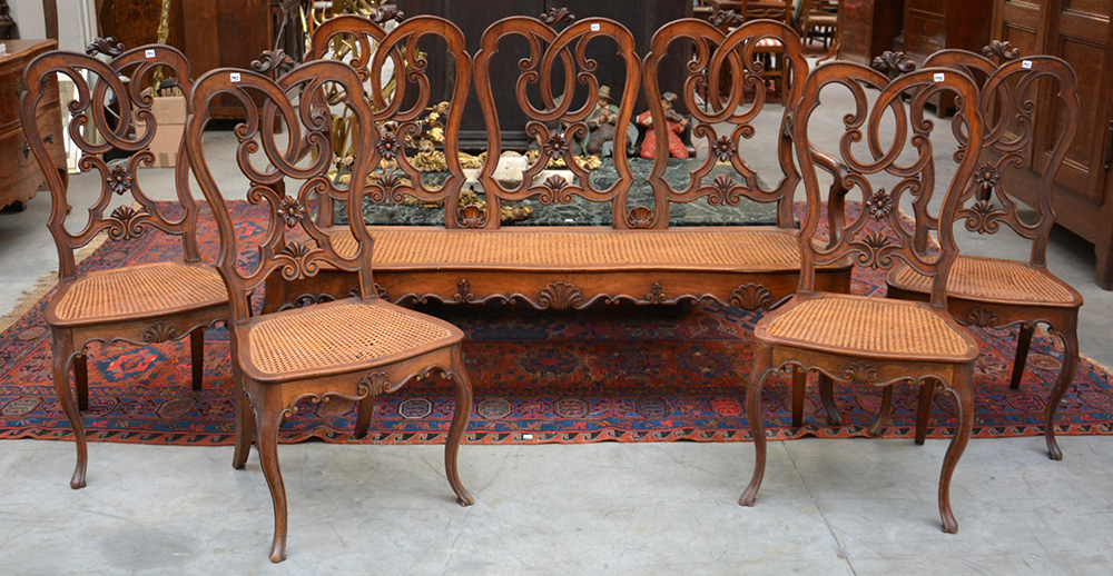 Fornitura da salotto in noce con schienali a cartelle traforati e intagliati a riccioli e volute. Composta da divano a tre posti e quattro sedie con seduta in cannetÈ. Sec. XIX (restauri)